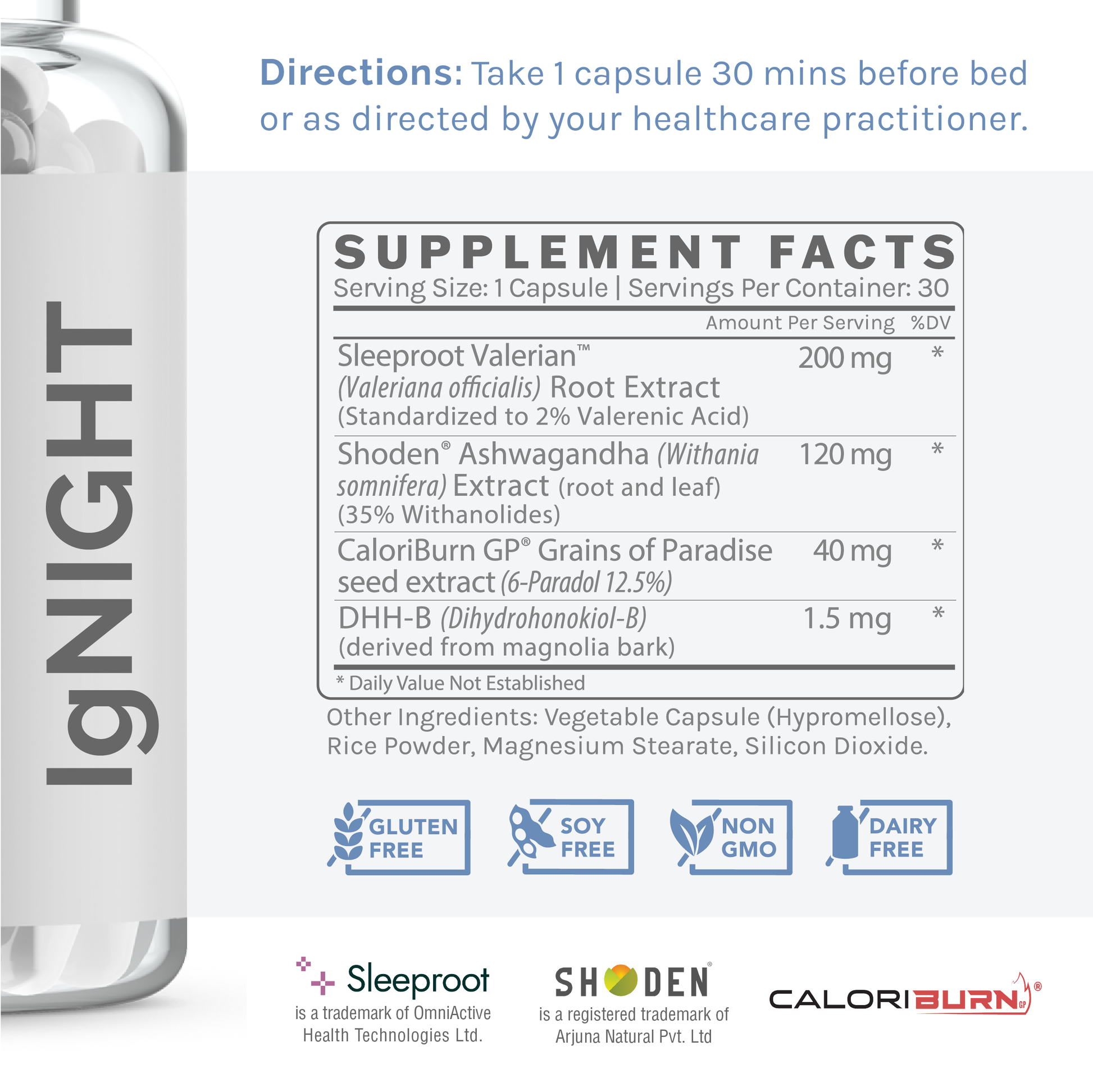 In a world filled with the hustle and bustle of modern life, finding a peaceful night's sleep can be elusive. Stress, anxiety, and the challenges of maintaining a healthy metabolism often stand in the way of the restorative slumber we all crave and need for optimal health. IgNIGHT features ingredients shown to balance circadian rhythm, provide hormonal support, as well as metabolic support and weight management. When it comes to getting the most out of your sleep, IgNIGHT delivers.